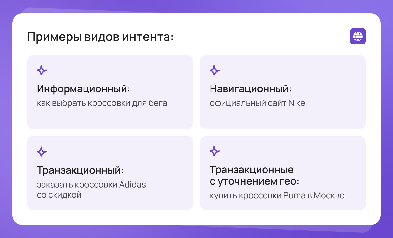 Намерение (интент) – это то, зачем пользователь открыл поисковую систему. И ваша задача – максимально точно попасть в его запрос.