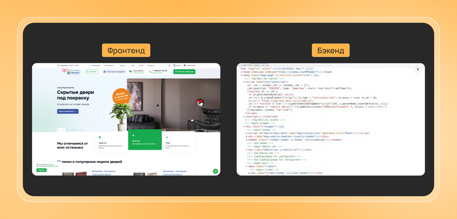 Фронтенд – видимая часть сайта, с которой взаимодействует пользователь. Бэкенд – «начинка», код, который работает на сервере и обеспечивает функционал.