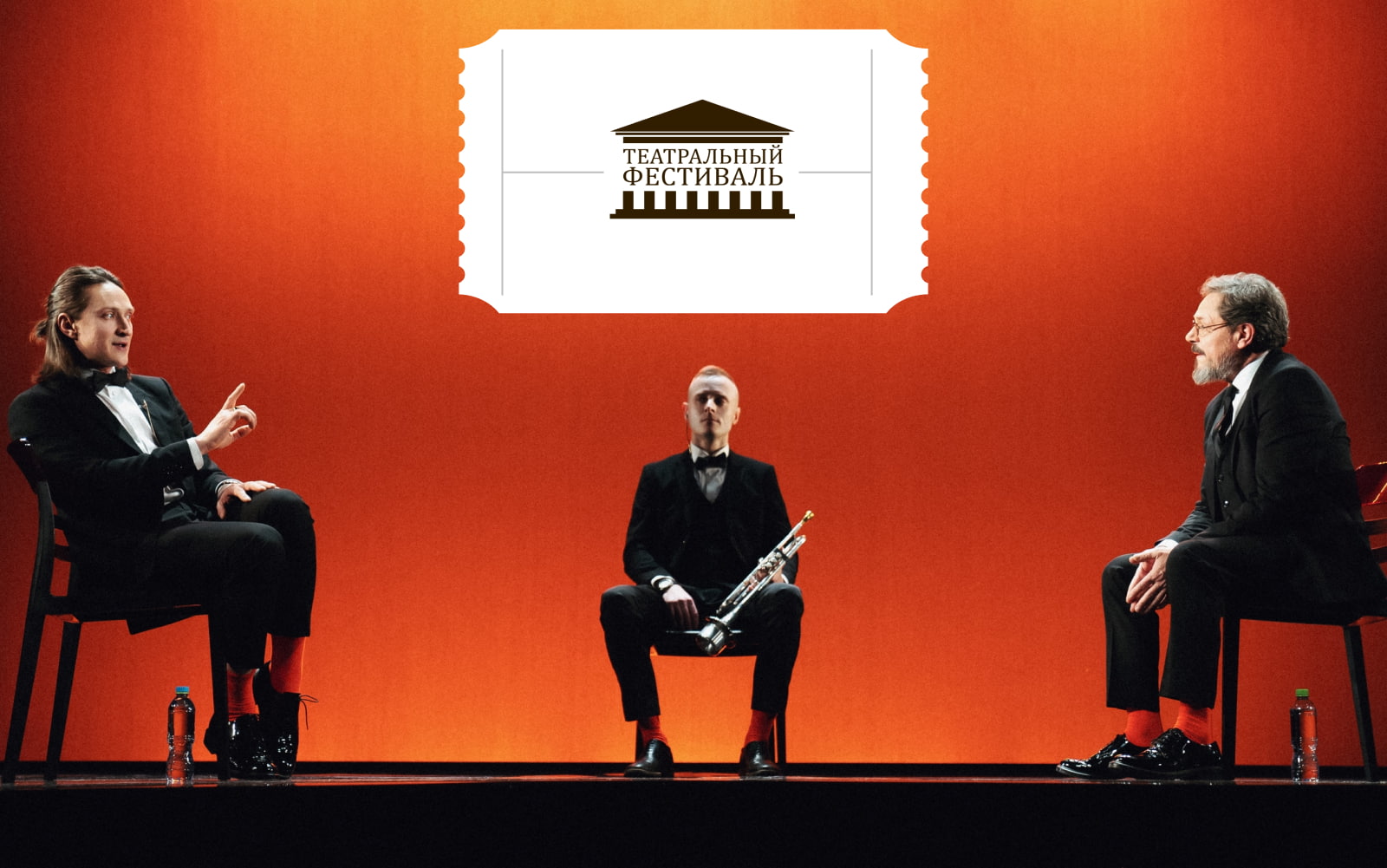 Крупные фотографии артистов и визуальный эффект направленного света создают ощущение сцены – будто уже поднялся занавес, и спектакль вот-вот начнётся.