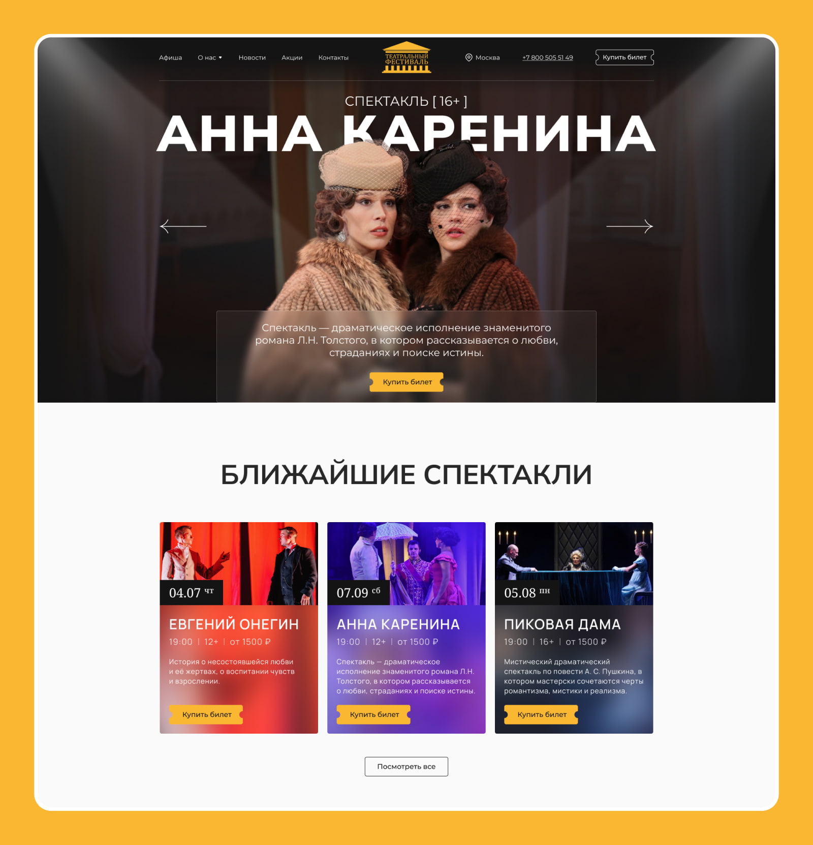 - Через анимацию, шрифты и цветовую систему передали ощущение живого театра прямо в интерфейсе.