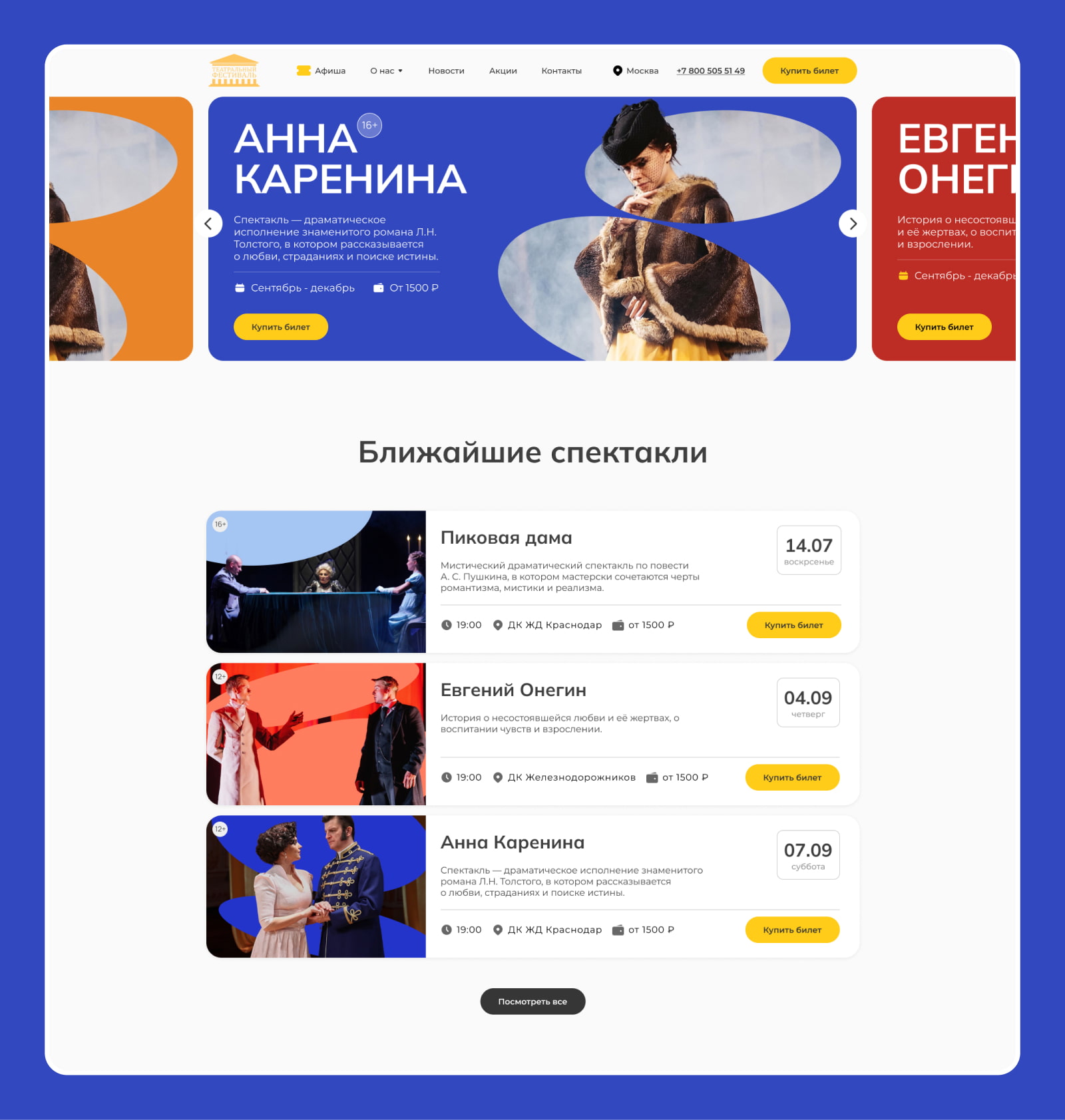 - Настроили понятную структуру карточек спектаклей: с датами, временем, ценами и условиями покупки.