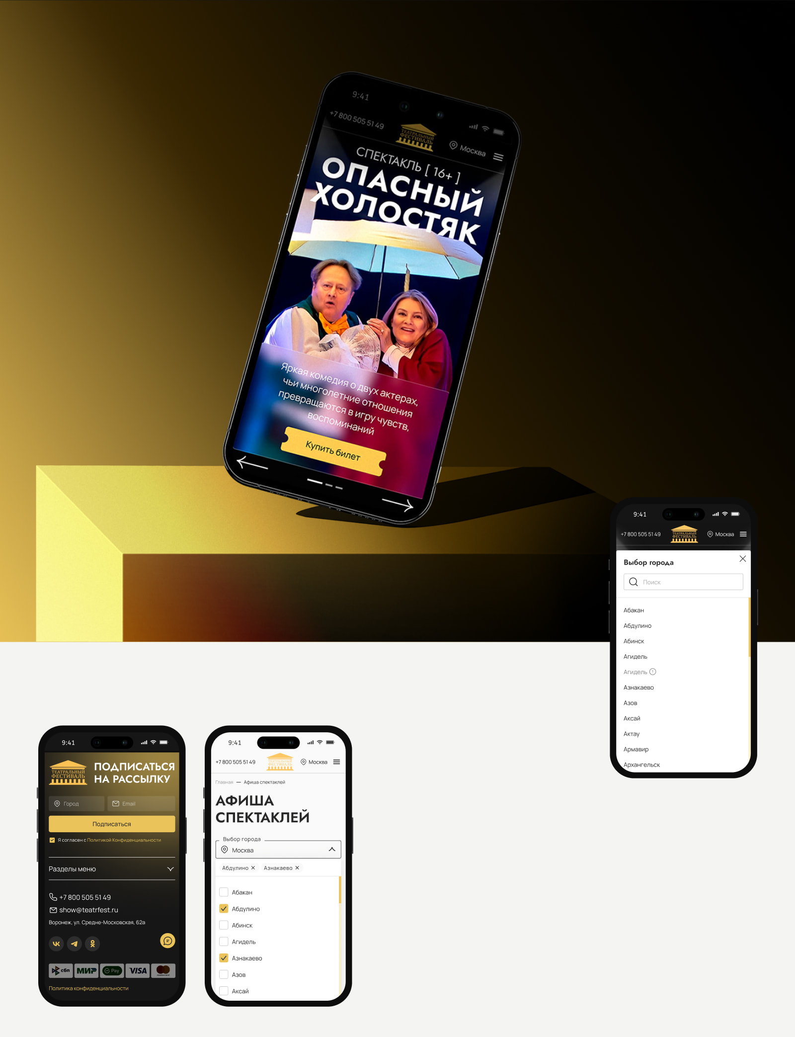 - Разработали афишу с фильтрацией по городам и автоопределением локации – сайт сам показывает ближайшие спектакли.