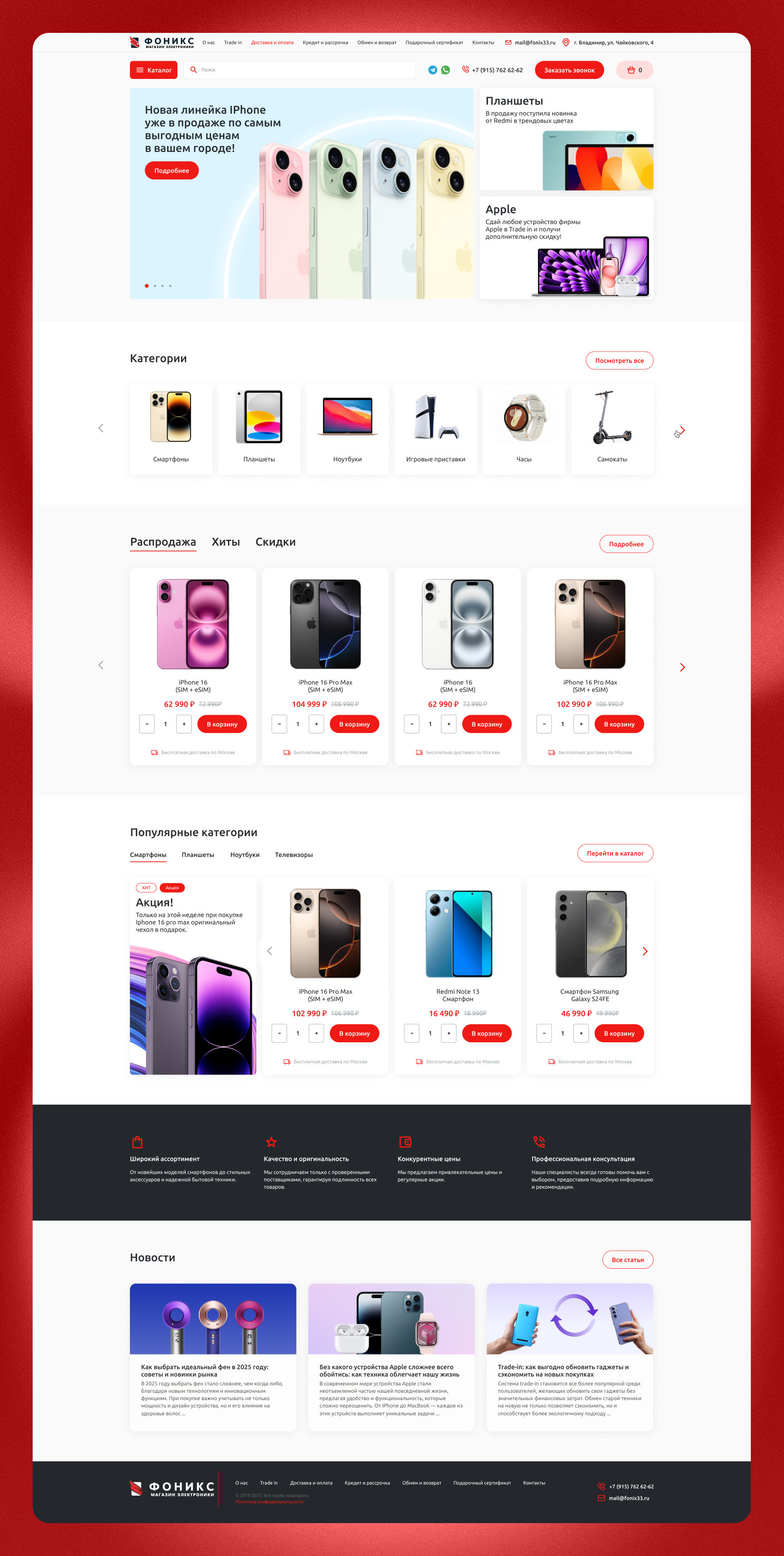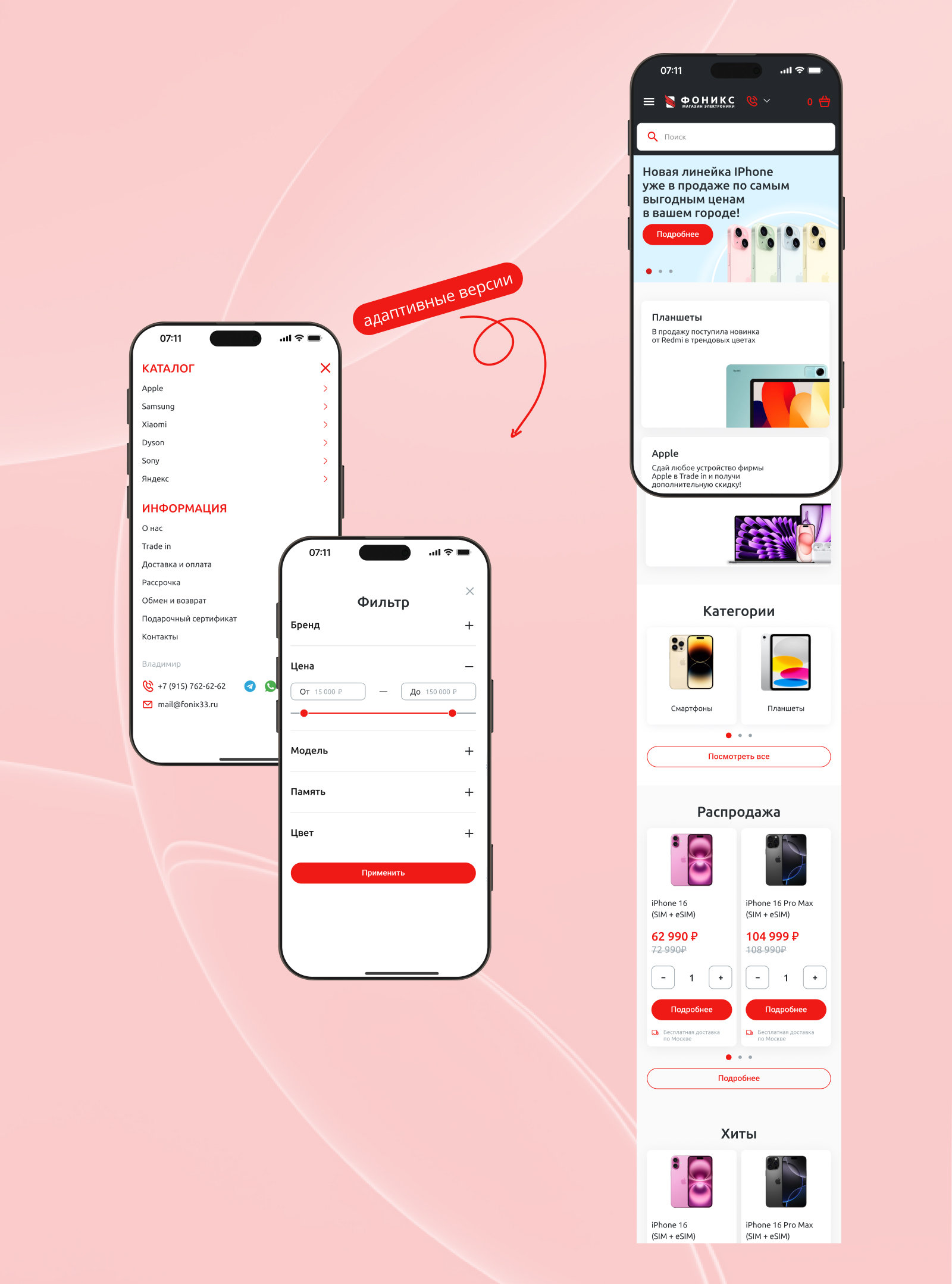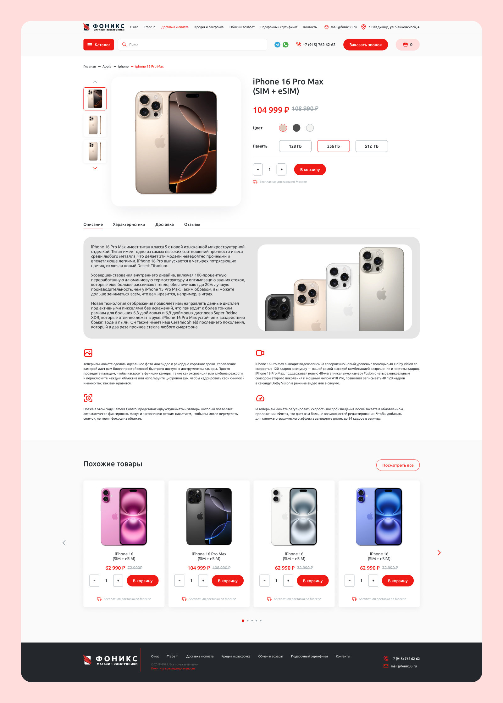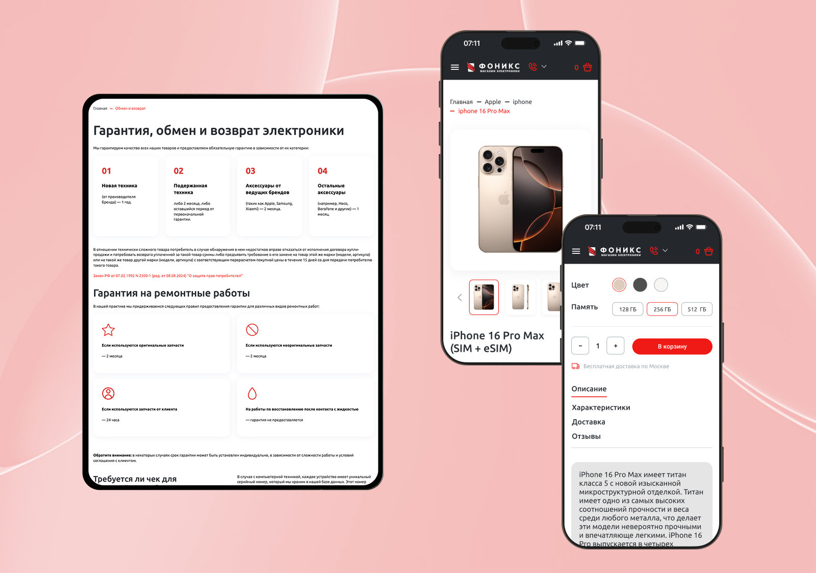 доработали блоки по пожеланию клиента, как на главной, так и на внутренних страницах. Не ограничились типовыми улучшениями, а тонко настроили ключевые блоки сайта в соответствии с запросами и инсайтами заказчика. В процессе работы клиент поделился экспертным видением и знаниями о своей аудитории, и мы внесли правки в структуру и содержание отдельных секций – как на главной странице, так и на внутренних. Ценность такого подхода в том, что сайт адаптирован под конкретный бизнес: учтены нюансы ассортимента «Фоникса», акценты бренда, привычки именно их покупателей.