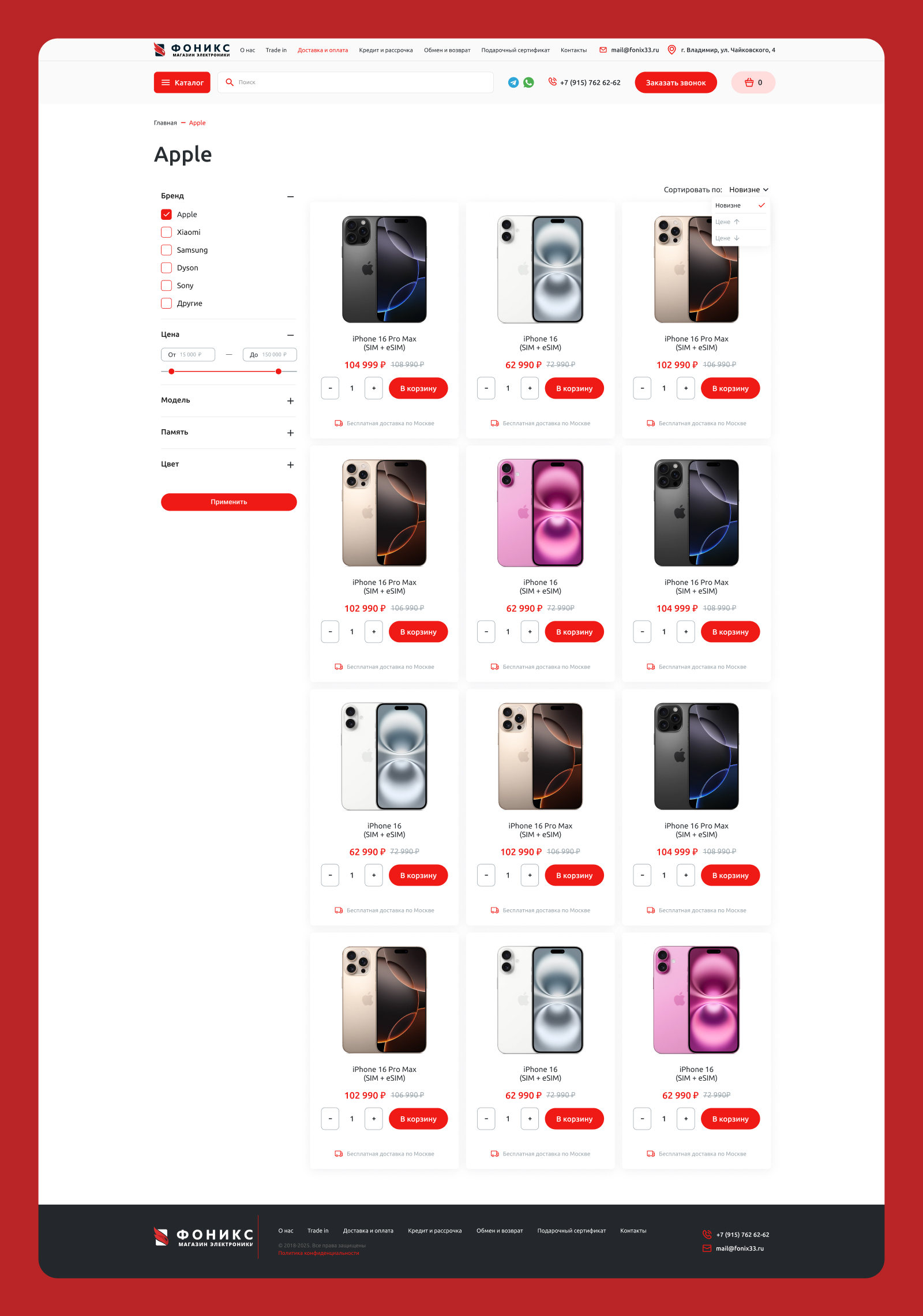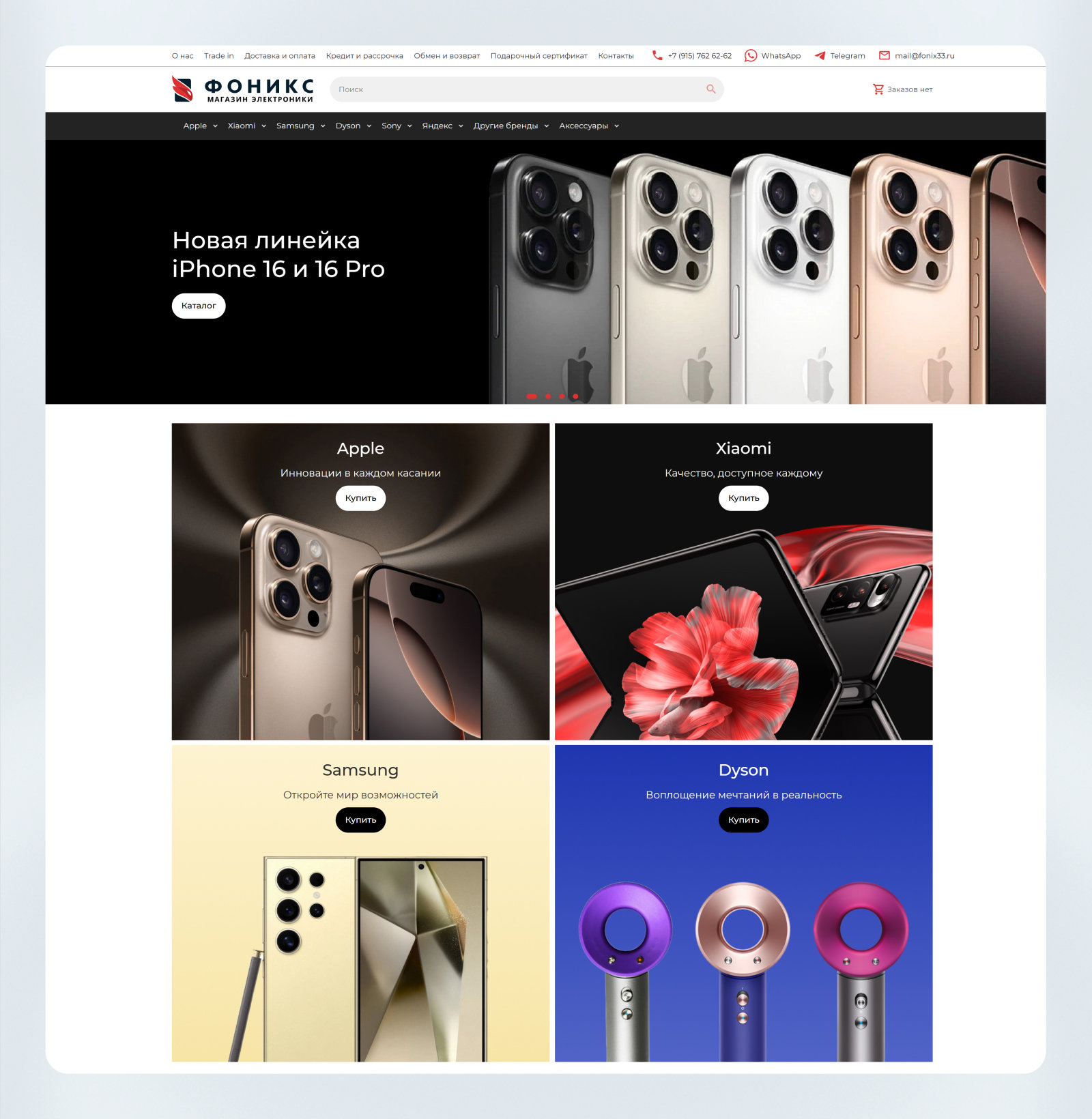 Расскажем немного о самом проекте. Фоникс – магазин электроники и аксессуаров во Владимире. В ассортименте: смартфоны, планшеты, игровые приставки, бытовая техника и аксессуары, в том числе бренды уровня Apple, Samsung, Dyson. Покупатель выбирает быстро, сравнивает модели и хочет сразу видеть условия: что в наличии и что под заказ, сколько стоит, как оплатить, как получить гарантию и можно ли доверять магазину.